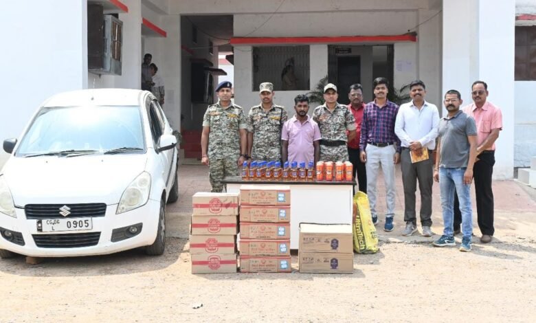 विवरण- श्रीमान पुलिस अधीक्षक महोदय जिला मोहला मानपुर अं०चौकी श्री यशपाल सिंह (IPS) के निर्देशन में एवं श्रीमान अतिरिक्त पुलिस अधीक्षक महोदय, श्री मयंक गुर्जर (IPS), अतिरिक्त पुलिस अधीक्षक महोदय, श्री पीताम्बर पटेल तथा श्रीमान पुलिस अनुविभागी अधिकारी महोदय अंबागढ़ चौकी श्री अर्जुन कुर्रे, उप पुलिस अधीक्षक (नक्स. आप्स) श्री ताजेश्वर दीवान के मार्ग दर्शन में चौकी पटनखास प्रभारी उप निरीक्षक श्री गणेश यादव के कुशल नेतृत्व में सुध्घर जन सुरक्षित जिला अभियान के तहत अपराधिक गतिविधियों पर सतत् निगरानी रखते हुए एवं आगामी लोकसभा चुनाव के दौरान आदर्श चुनाव आचार संहिता को ध्यान में रखते हुए अवैध शराब कोचियों/तस्करो पर लगातार कार्यवाही की जा रही है दिनांक 01.04.2024 को MCP कार्यवाही के दौरान संदिग्ध वाहन मारुति सुजुकी कार RITZ- CG06L0905 का चालक पुलिस पार्टी को देखकर गाड़ी छोड़कर भाग रहा था जिसे MCP कार्यवाही पर लगे जवानों के द्वारा घेराबंदी कर पकड़ा गया। उक्त वाहन चालक के द्वारा गाड़ी की तलाशी करवाने पर गाड़ी एवं उसके डिक्की पर रखें बड़ी मात्रा मे शराब रखा था। चालक से शराब रखने के सम्बन्ध मे पूछताछ करने पर शराब बिक्री हेतु ले जाना बताया आरोपी – अमित टेमबुल्कर पिता रामलाल उम्र 31वर्ष सकिन ग्राम कोसमी थाना कोटगुल जिला गड़चिरोली की गाड़ी में रखे अवैध शराब (1) 5 पेटी haywards 5000 बियर प्रत्येक पेटी में 24 नग प्रत्येक की कैपिसिटी 500 ml total 120 नग टोटल 60 लीटर कीमती 15,600 रुपए। (2) 5 पेटी देशी संत्री शराब प्रत्येक में 48 नग प्रत्येक की कैपिसिटी 180 ml टोटल, 43.200 लीटर कीमती 16,800 रुपए। (3) 2 पेटी इंपीरियल ब्लू अंग्रेजी शराब प्रत्येक पेटी में 48 नग प्रत्येक की कैपिसिटी 180ml टोटल 17.280 लीटर कीमती 15,360 रुपए। (4) एक कार मारुति सुजुकी ritz cg 06 L 0905 कीमती 2,40,000 रुपए।