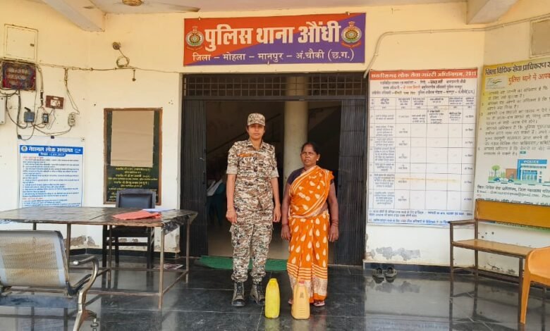 श्रीमान पुलिस अधीक्षक महोदय जिला मोहला मानपुर अं0 चौकी श्री वाय .पी. सिंह (भा.पु.से) के निर्देशन मे व श्रीमान अतिरिक्त पुलिस अधीक्षक महोदय जिला मोहला मानपुर अं0चौकी श्री मंयक गुर्जर (भा.पु.से), श्रीमान अतिरिक्त पुलिस अधीक्षक महोदय श्री पीतांबर पटेल, श्रीमान पुलिस अनुविभागीय अधिकारी मानपुर श्री मंयक तिवारी के मार्गदर्शन मे थाना प्रभारी सुशील कुमार त्रिपाठी के कुशल नेतृत्व मे लगातार थाना क्षेत्र मे पेट्रोलिग कराया जा रहा है। व सुग्धर जन सुरक्षित मोहला मानपुर अभियान के तहत् अपराधिक गतिविधियो पर सतत निगरानी करते हुये लगातार कार्यवाही की जा रही है। इसी तारतम्य मे आज दिनांक 03.04.2024 को अपराध की रोकथाम हेतु थाना क्षेत्रान्तर्गत जुर्म जरायम पतासाजी हेतु थाना औधी पुलिस द्वारा मुखबीर की सुचना पर ग्राम सरखेडा मे आरोपिया बिसंती बाई पति कलीराम बढाई उम्र 50 वर्ष निवासी सरखेडा थाना औंधी जिला मोहला मानपुर अं0 चौकी का ब्रिकी कर अवैध रूप से लाभ कमाने के उदेश्य से घर बाडी मे छिपाकर रखी थी । कि सुचना पर मौके पर पहूचकर रेड कार्यवाही किया गया जिसके कब्जे से प्लास्टिक जरीकेन 05-05 लीटर वाले मे भरा हुआ कुल 10लीटर कच्ची हाथ भटटी महुआ शराब कीमती 1500 रूपये एंव ब्रिकी रकम 230 रूपये जुमला कीमती 1750 रूपये को जप्त कर कब्जा पुलिस लिया गया आरोपिया के विरूद्व अपराध क्रमांक 10/24 धारा 34(2)आबकारी एक्ट कायम कर विवेचना कार्यवाही मे लिया गया ।