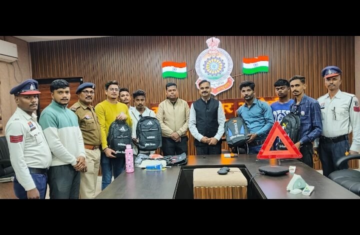 सड़क दुर्घटनाओं में पीड़ितों को मदद करने वाले पुलिस मितानों को वितरण किया गया सुरक्षा किट।